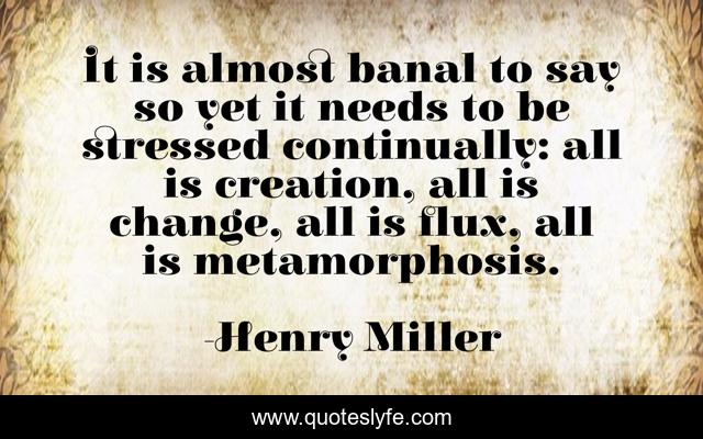 This page presents the quote "It is almost banal to say so yet it needs to be stressed continually: all is creation, all is change, all is flux, all is metamorphosis.". Author of this quote is Henry Miller. This quote is about flux, creation,.