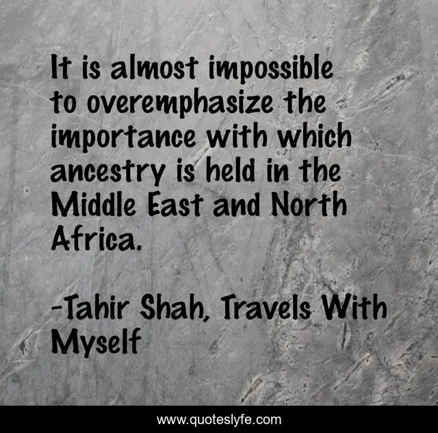 This page presents the quote "It is almost impossible to overemphasize the importance with which ancestry is held in the Middle East and North Africa.". Author of this quote is Tahir Shah, Travels With Myself. This quote is about africa, ancestry, middle-east,.