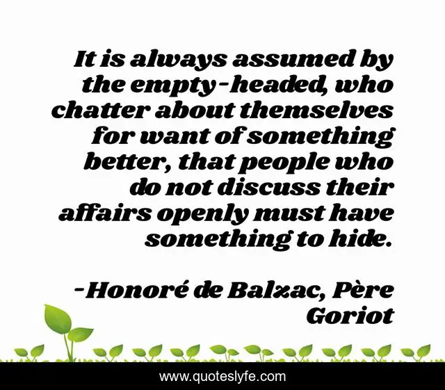 This page presents the quote "It is always assumed by the empty-headed, who chatter about themselves for want of something better, that people who do not discuss their affairs openly must have something to hide.". Author of this quote is Honoré de Balzac, Père Goriot. This quote is about gossip, reticence, psychology, silence, remaining-silent,.
