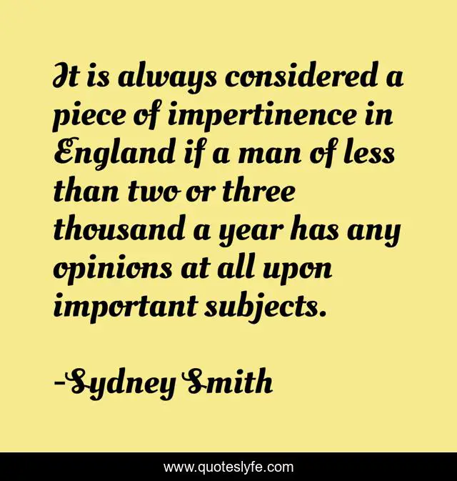 This page presents the quote "It is always considered a piece of impertinence in England if a man of less than two or three thousand a year has any opinions at all upon important subjects.". Author of this quote is Sydney Smith. .