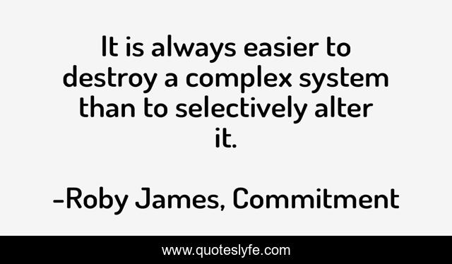 This page presents the quote "It is always easier to destroy a complex system than to selectively alter it.". Author of this quote is Roby James, Commitment. This quote is about complex, systems, change,.