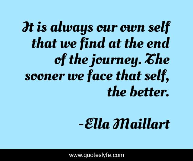 This page presents the quote "It is always our own self that we find at the end of the journey. The sooner we face that self, the better.". Author of this quote is Ella Maillart. This quote is about self, journey, end,.