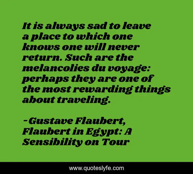 This page presents the quote "It is always sad to leave a place to which one knows one will never return. Such are the melancolies du voyage: perhaps they are one of the most rewarding things about traveling.". Author of this quote is Gustave Flaubert, Flaubert in Egypt: A Sensibility on Tour. This quote is about travel, tourism,.