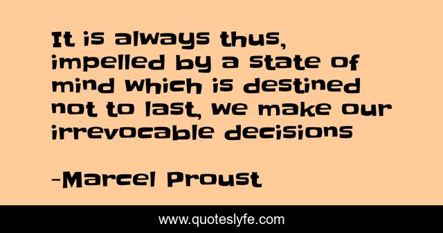 This page presents the quote "It is always thus, impelled by a state of mind which is destined not to last, we make our irrevocable decisions". Author of this quote is Marcel Proust. .