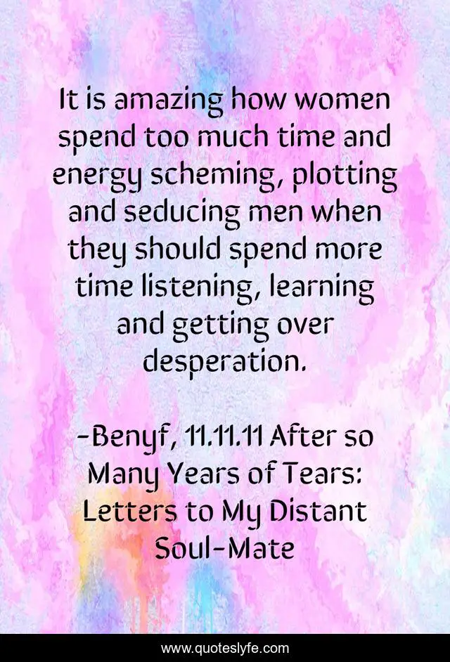 This page presents the quote "It is amazing how women spend too much time and energy scheming, plotting and seducing men when they should spend more time listening, learning and getting over desperation.". Author of this quote is Benyf, 11.11.11 After so Many Years of Tears: Letters to My Distant Soul-Mate. This quote is about broken-heart, desperation, woman-scorned, women-s-strength, healing, desperate, seductive,.