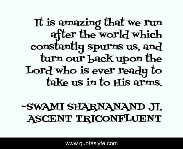This page presents the quote "It is amazing that we run after the world which constantly spurns us, and turn our back upon the Lord who is ever ready to take us in to His arms.". Author of this quote is SWAMI SHARNANAND JI, ASCENT TRICONFLUENT. This quote is about god, life, spiritual, inspirational, enthusiasm,.