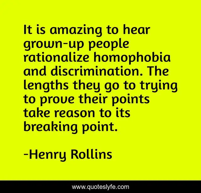 This page presents the quote "It is amazing to hear grown-up people rationalize homophobia and discrimination. The lengths they go to trying to prove their points take reason to its breaking point.". Author of this quote is Henry Rollins. This quote is about discrimination, people,.
