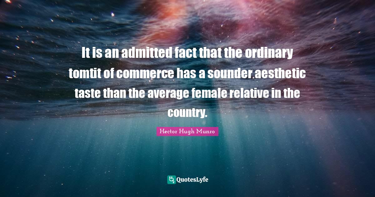 This page presents the quote "It is an admitted fact that the ordinary tomtit of commerce has a sounder aesthetic taste than the average female relative in the country.". Author of this quote is Hector Hugh Munro. This quote is about commerce, taste, country, sounder, average, aesthetic, ordinary, female, relative,.