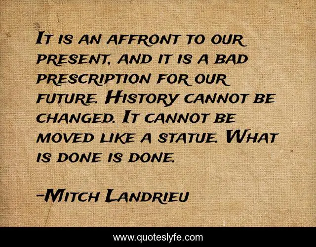 This page presents the quote "It is an affront to our present, and it is a bad prescription for our future. History cannot be changed. It cannot be moved like a statue. What is done is done.". Author of this quote is Mitch Landrieu. This quote is about new-orleans, face-the-truth, history,.