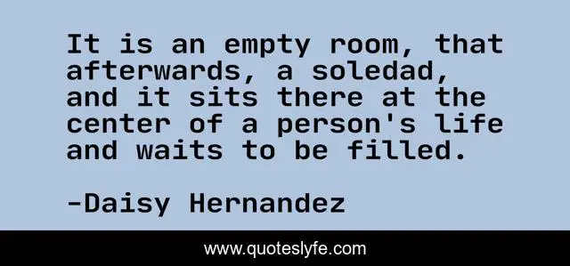 This page presents the quote "It is an empty room, that afterwards, a soledad, and it sits there at the center of a person's life and waits to be filled.". Author of this quote is Daisy Hernandez. .