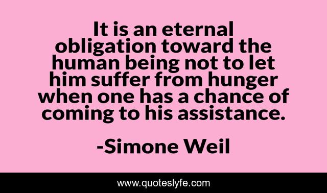 This page presents the quote "It is an eternal obligation toward the human being not to let him suffer from hunger when one has a chance of coming to his assistance.". Author of this quote is Simone Weil. This quote is about human being, human, hunger,.