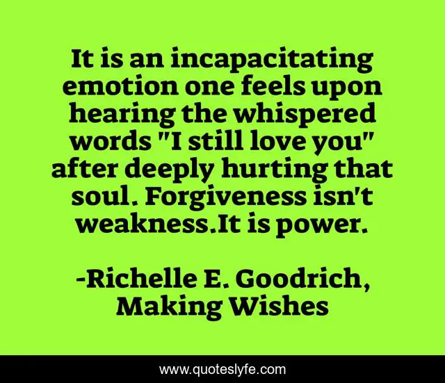 This page presents the quote "It is an incapacitating emotion one feels upon hearing the whispered words "I still love you" after deeply hurting that soul. Forgiveness isn't weakness.It is power.". Author of this quote is Richelle E. Goodrich, Making Wishes. This quote is about mercy, love, power, compassion, richelle-e-goodrich, richelle, richelle-goodrich, kindness, forgiveness,.