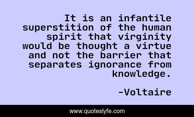 This page presents the quote "It is an infantile superstition of the human spirit that virginity would be thought a virtue and not the barrier that separates ignorance from knowledge.". Author of this quote is Voltaire. This quote is about virginity, knowledge, ignorance, virtue,.