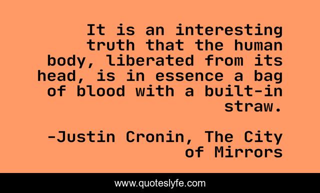 This page presents the quote "It is an interesting truth that the human body, liberated from its head, is in essence a bag of blood with a built-in straw.". Author of this quote is Justin Cronin, The City of Mirrors. .