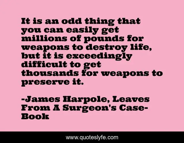 This page presents the quote "It is an odd thing that you can easily get millions of pounds for weapons to destroy life, but it is exceedingly difficult to get thousands for weapons to preserve it.". Author of this quote is James Harpole, Leaves From A Surgeon's Case-Book. This quote is about medicine, war,.
