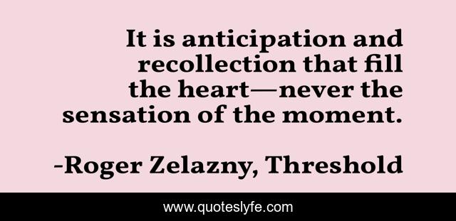 This page presents the quote "It is anticipation and recollection that fill the heart—never the sensation of the moment.". Author of this quote is Roger Zelazny, Threshold. This quote is about happiness, memory,.