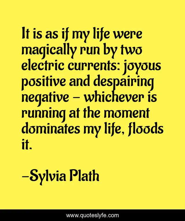 This page presents the quote "It is as if my life were magically run by two electric currents: joyous positive and despairing negative - whichever is running at the moment dominates my life, floods it.". Author of this quote is Sylvia Plath. This quote is about life, moment, negative,.
