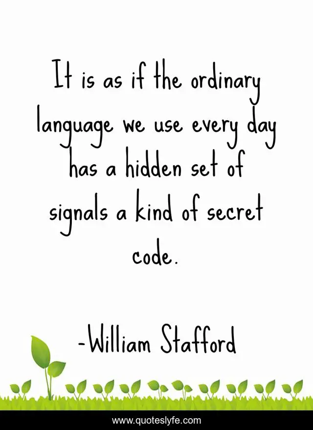 This page presents the quote "It is as if the ordinary language we use every day has a hidden set of signals a kind of secret code.". Author of this quote is William Stafford. This quote is about law, lawyers,.