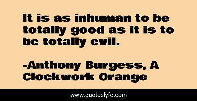 This page presents the quote "It is as inhuman to be totally good as it is to be totally evil.". Author of this quote is Anthony Burgess, A Clockwork Orange. This quote is about good, humans, humanity, evil,.