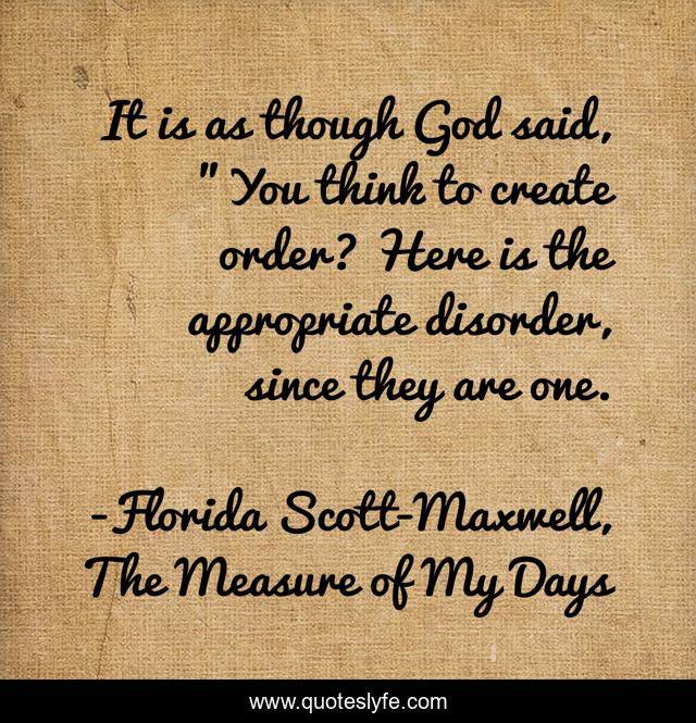 This page presents the quote "It is as though God said, "You think to create order? Here is the appropriate disorder, since they are one.". Author of this quote is Florida Scott-Maxwell, The Measure of My Days. This quote is about creation, good-and-bad-times, orderliness-of-life,.