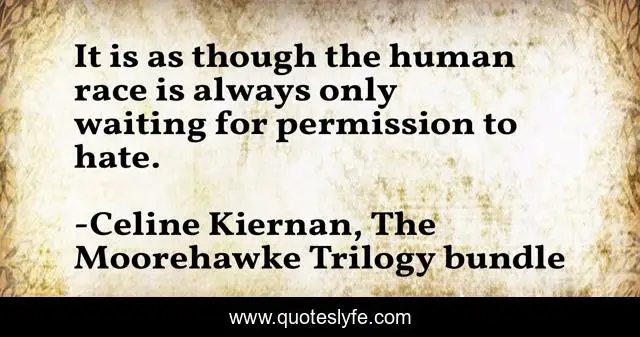 This page presents the quote "It is as though the human race is always only waiting for permission to hate.". Author of this quote is Celine Kiernan, The Moorehawke Trilogy bundle. This quote is about race, hate, humanity,.