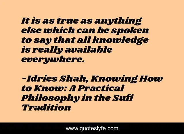 This page presents the quote "It is as true as anything else which can be spoken to say that all knowledge is really available everywhere.". Author of this quote is Idries Shah, Knowing How to Know: A Practical Philosophy in the Sufi Tradition. This quote is about sufism, sufis, psychology, wisdom,.