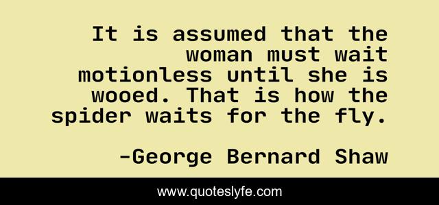 This page presents the quote "It is assumed that the woman must wait motionless until she is wooed. That is how the spider waits for the fly.". Author of this quote is George Bernard Shaw. This quote is about love, marriage, affection,.