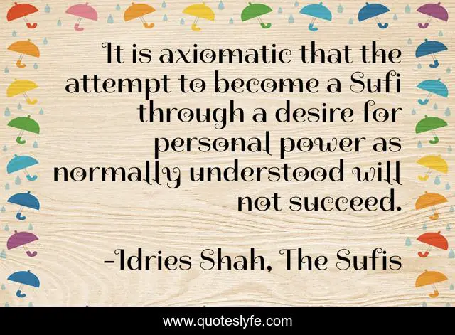 This page presents the quote "It is axiomatic that the attempt to become a Sufi through a desire for personal power as normally understood will not succeed.". Author of this quote is Idries Shah, The Sufis. This quote is about egocerity, psychology, sufi, mind, sufism, sincerity, sufis, concealment, greed,.