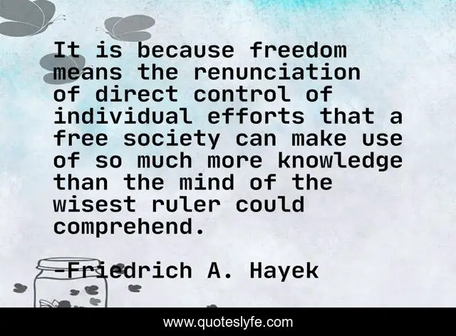 This page presents the quote "It is because freedom means the renunciation of direct control of individual efforts that a free society can make use of so much more knowledge than the mind of the wisest ruler could comprehend.". Author of this quote is Friedrich A. Hayek. This quote is about anarchy, government, freedom, laissez-faire, ancap, liberty, capitalism, austrian-school-of-economics, free-markets,.