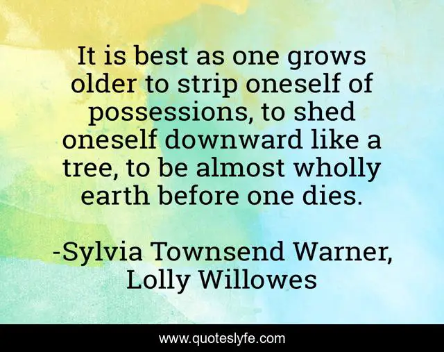 This page presents the quote "It is best as one grows older to strip oneself of possessions, to shed oneself downward like a tree, to be almost wholly earth before one dies.". Author of this quote is Sylvia Townsend Warner, Lolly Willowes. This quote is about aging, death-and-dying,.