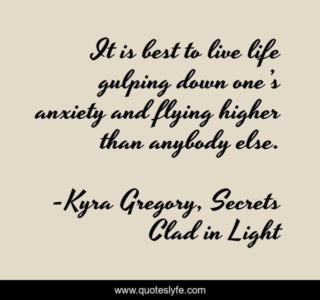 This page presents the quote "It is best to live life gulping down one’s anxiety and flying higher than anybody else.". Author of this quote is Kyra Gregory, Secrets Clad in Light. This quote is about life, optimism, behaviour, attitude, inspirational, enthusiasm, life-and-living,.