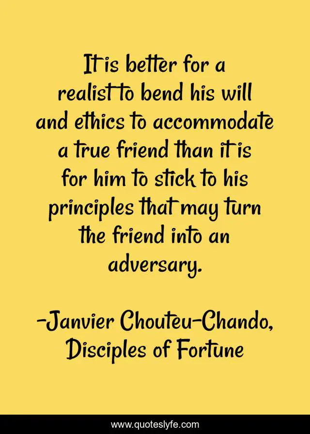 This page presents the quote "It is better for a realist to bend his will and ethics to accommodate a true friend than it is for him to stick to his principles that may turn the friend into an adversary.". Author of this quote is Janvier Chouteu-Chando, Disciples of Fortune. This quote is about friendship, wisdom, humor, inspirational, enthusiasm,.
