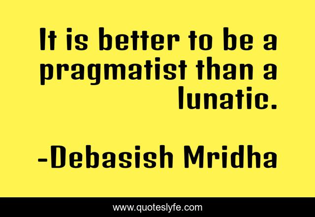 This page presents the quote "It is better to be a pragmatist than a lunatic.". Author of this quote is Debasish Mridha. This quote is about lunatic, philosophy, debasish-mridha, quotes, debasish-mridha-md, inspirational, it-is-better-to-be-a-pragmatist, enthusiasm,.