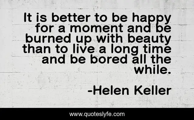 This page presents the quote "It is better to be happy for a moment and be burned up with beauty than to live a long time and be bored all the while.". Author of this quote is Helen Keller. This quote is about boredom, beauty,.