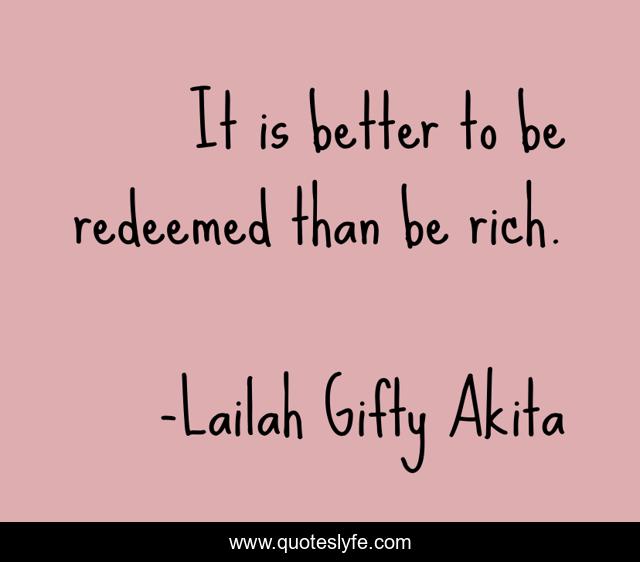 This page presents the quote "It is better to be redeemed than be rich.". Author of this quote is Lailah Gifty Akita. This quote is about wise-words, christian, life-lessons, religion, redeem, rich, inspiration,.
