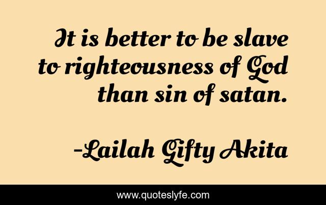This page presents the quote "It is better to be slave to righteousness of God than sin of satan.". Author of this quote is Lailah Gifty Akita. This quote is about faith, righteousness, christian, life-lessons, god, theology, satan, inspirational, enthusiasm,.