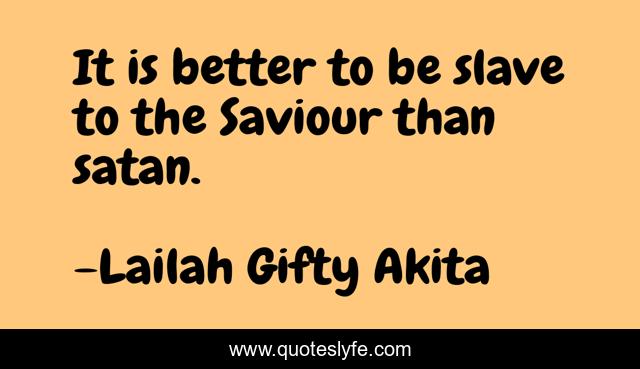 This page presents the quote "It is better to be slave to the Saviour than satan.". Author of this quote is Lailah Gifty Akita. This quote is about good, christian, slave, evil, saviour, religion, satan, inspirational, enthusiasm,.