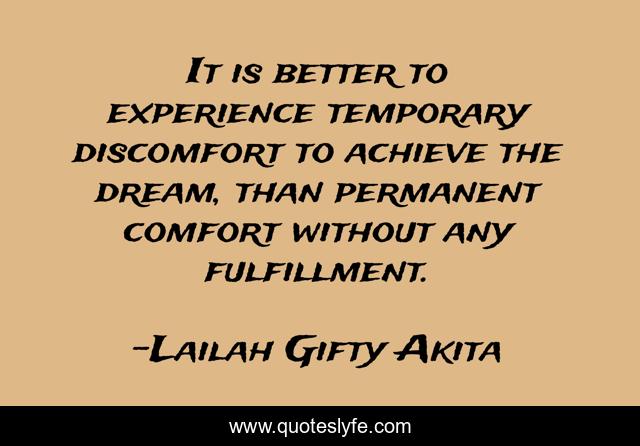 This page presents the quote "It is better to experience temporary discomfort to achieve the dream, than permanent comfort without any fulfillment.". Author of this quote is Lailah Gifty Akita. This quote is about success, experience, dreams, life-lessons, fulfilling-purpose, achievement, never-give-up,.