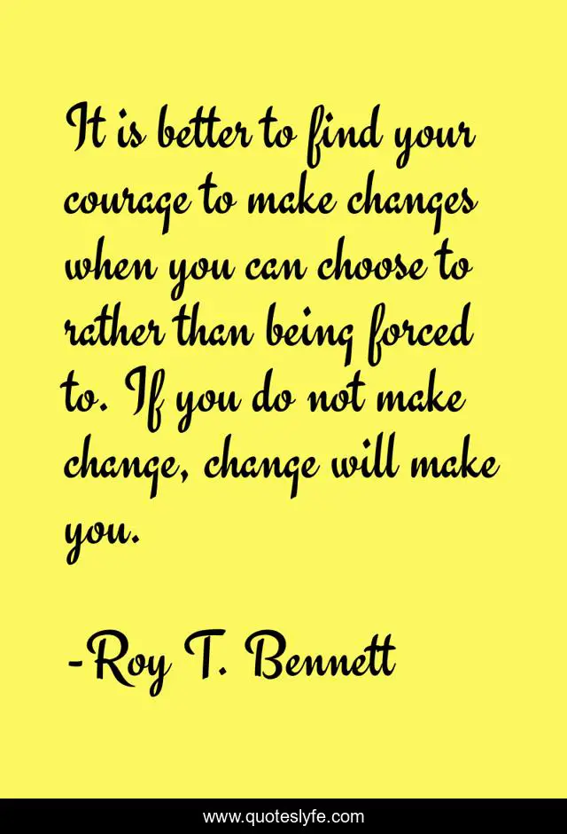 This page presents the quote "It is better to find your courage to make changes when you can choose to rather than being forced to. If you do not make change, change will make you.". Author of this quote is Roy T. Bennett. This quote is about living, inspiring, inspire, positive, positive-affirmation, motivational, life, confidence, optimism,.