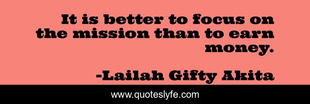 This page presents the quote "It is better to focus on the mission than to earn money.". Author of this quote is Lailah Gifty Akita. This quote is about lailah-gifty-akita-affirmations, money, focus, mission, self-realization, inspirational, enthusiasm,.