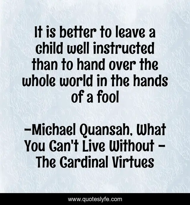 This page presents the quote "It is better to leave a child well instructed than to hand over the whole world in the hands of a fool". Author of this quote is Michael Quansah, What You Can't Live Without - The Cardinal Virtues. This quote is about virtues, life-lessons,.