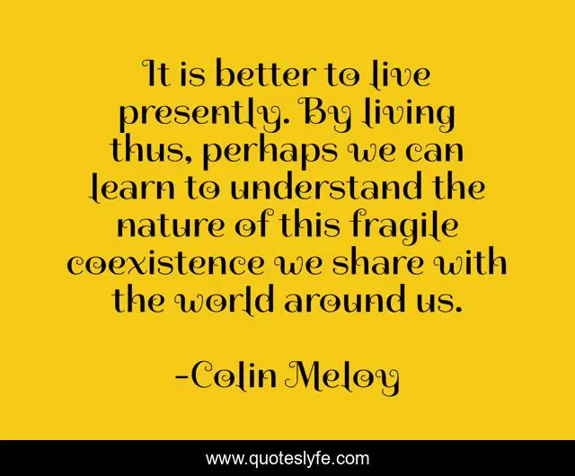 This page presents the quote "It is better to live presently. By living thus, perhaps we can learn to understand the nature of this fragile coexistence we share with the world around us.". Author of this quote is Colin Meloy. This quote is about novel, wildwood,.