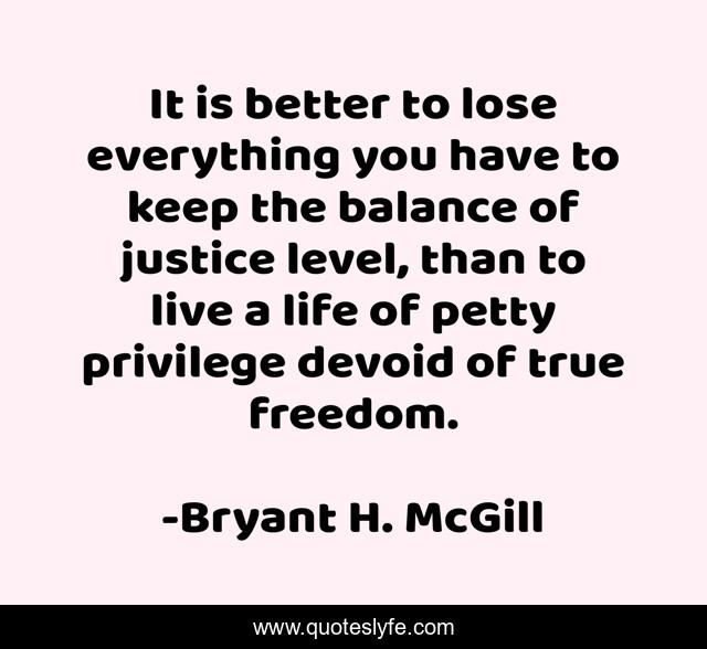 This page presents the quote "It is better to lose everything you have to keep the balance of justice level, than to live a life of petty privilege devoid of true freedom.". Author of this quote is Bryant H. McGill. This quote is about justice, life, balance,.