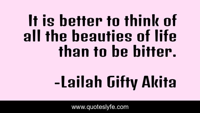 This page presents the quote "It is better to think of all the beauties of life than to be bitter.". Author of this quote is Lailah Gifty Akita. This quote is about positive-attitude, inspirational, positive-thoughts, enthusiasm, bitter, think,.