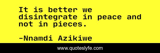 This page presents the quote "It is better we disintegrate in peace and not in pieces.". Author of this quote is Nnamdi Azikiwe. This quote is about better, pieces,.