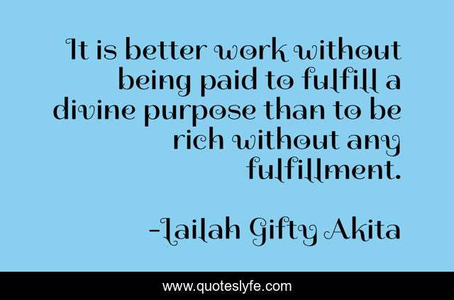 This page presents the quote "It is better work without being paid to fulfill a divine purpose than to be rich without any fulfillment.". Author of this quote is Lailah Gifty Akita. This quote is about calling, decision, work, riches, mission, encouragement, choices, wisdom-of-lailah-gifty-akita, passion,.