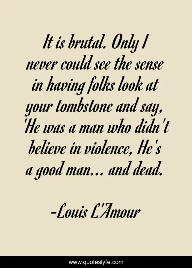 This page presents the quote "It is brutal. Only I never could see the sense in having folks look at your tombstone and say, 'He was a man who didn't believe in violence, He's a good man... and dead.". Author of this quote is Louis L'Amour. This quote is about l-amour, death, violence, noremorse, western,.