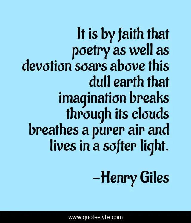 This page presents the quote "It is by faith that poetry as well as devotion soars above this dull earth that imagination breaks through its clouds breathes a purer air and lives in a softer light.". Author of this quote is Henry Giles. This quote is about faith, unity,.