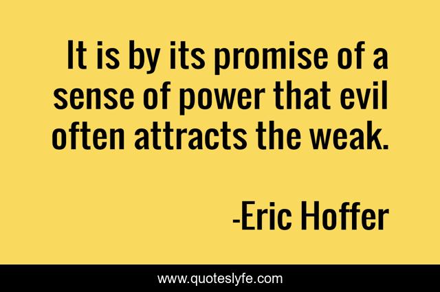 This page presents the quote "It is by its promise of a sense of power that evil often attracts the weak.". Author of this quote is Eric Hoffer. This quote is about weak, evil, sense,.