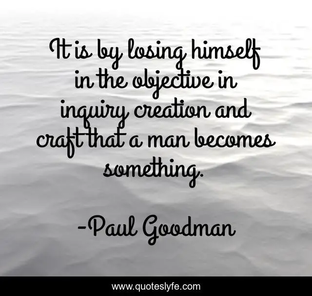 This page presents the quote "It is by losing himself in the objective in inquiry creation and craft that a man becomes something.". Author of this quote is Paul Goodman. .